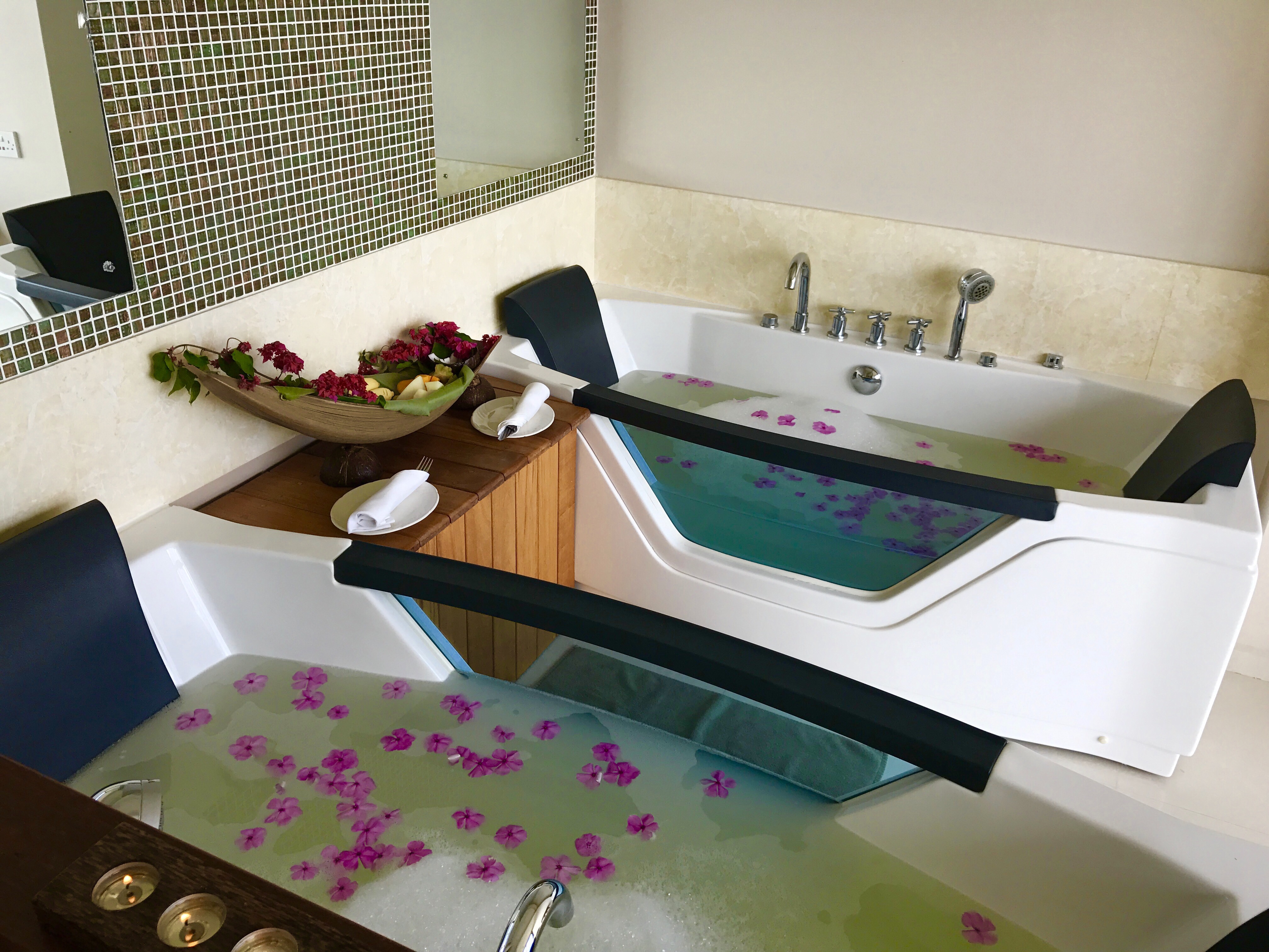 Today we will let ourselves spoiled with a full facial and couple massage, ending our holiday in a perfect environment, a beautiful SPA above the sea. Meenasree is our host today and after being welcomed with a delicious cocktail made of cinamon and orange, we are asked to fill a questionnaire which seems weird in the beginning but will make so much sense later on. Based on our date of birth, Meenasree is choosing the right essence to create the perfect balance between the mind and the body. My element is Earth while Abdulla’s is Sky, we are total opposite (Ying and Yang) but we complement each other perfectly.