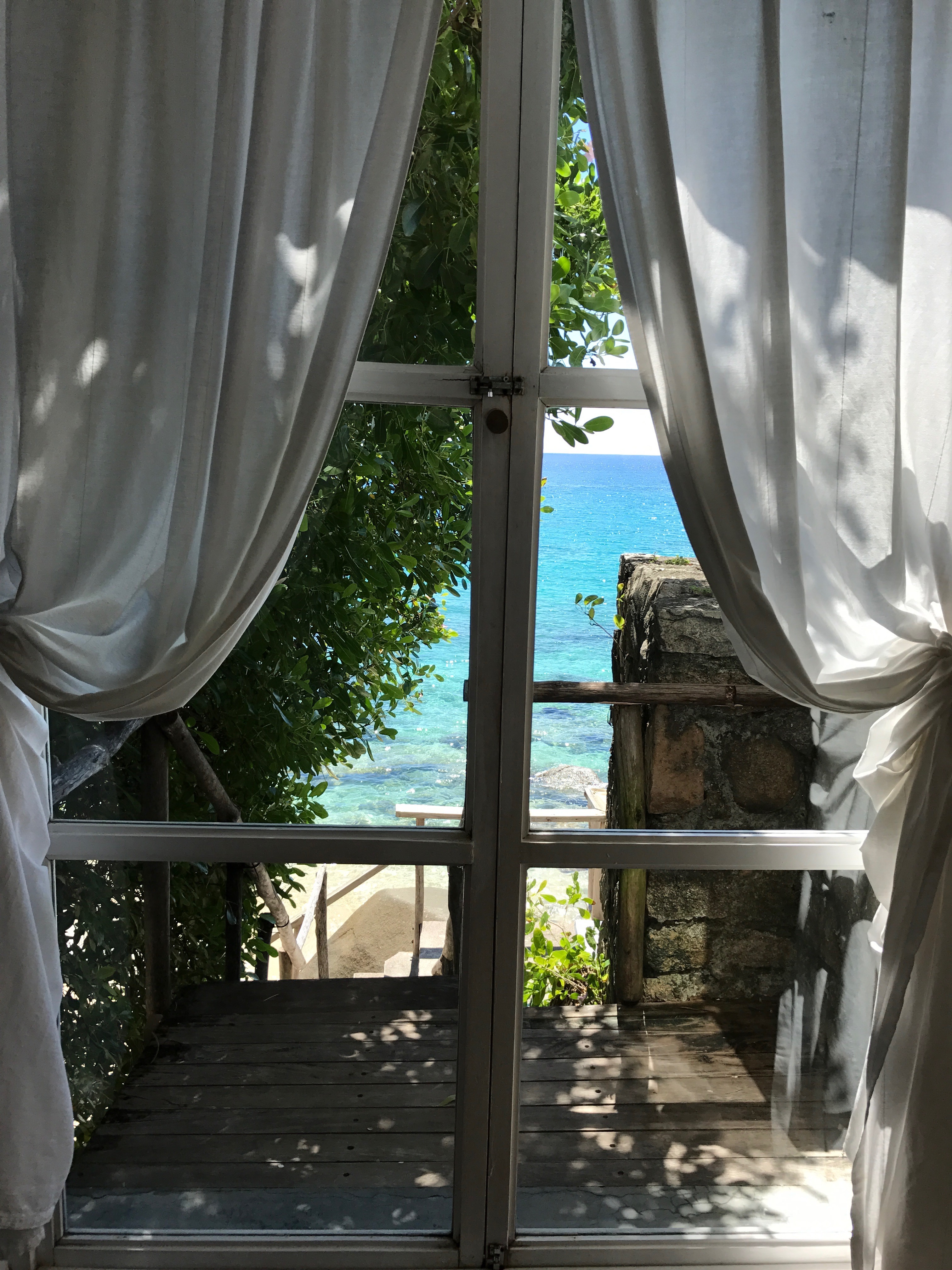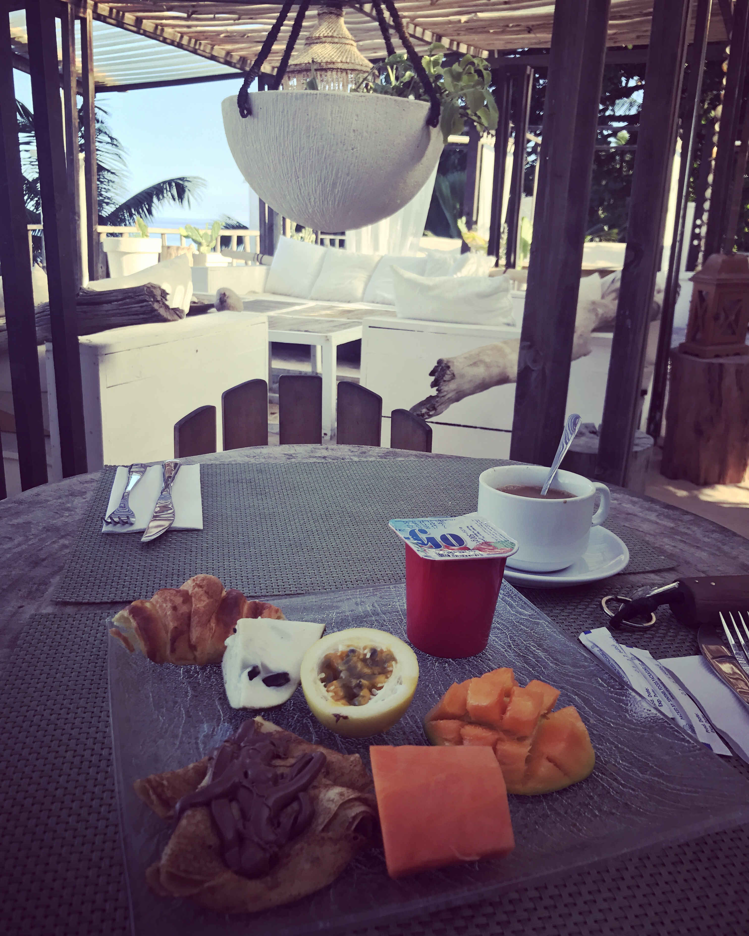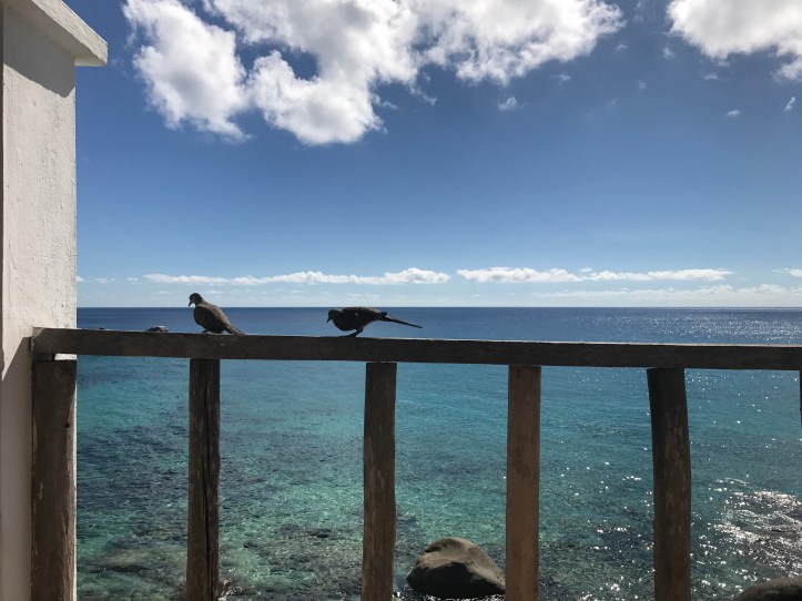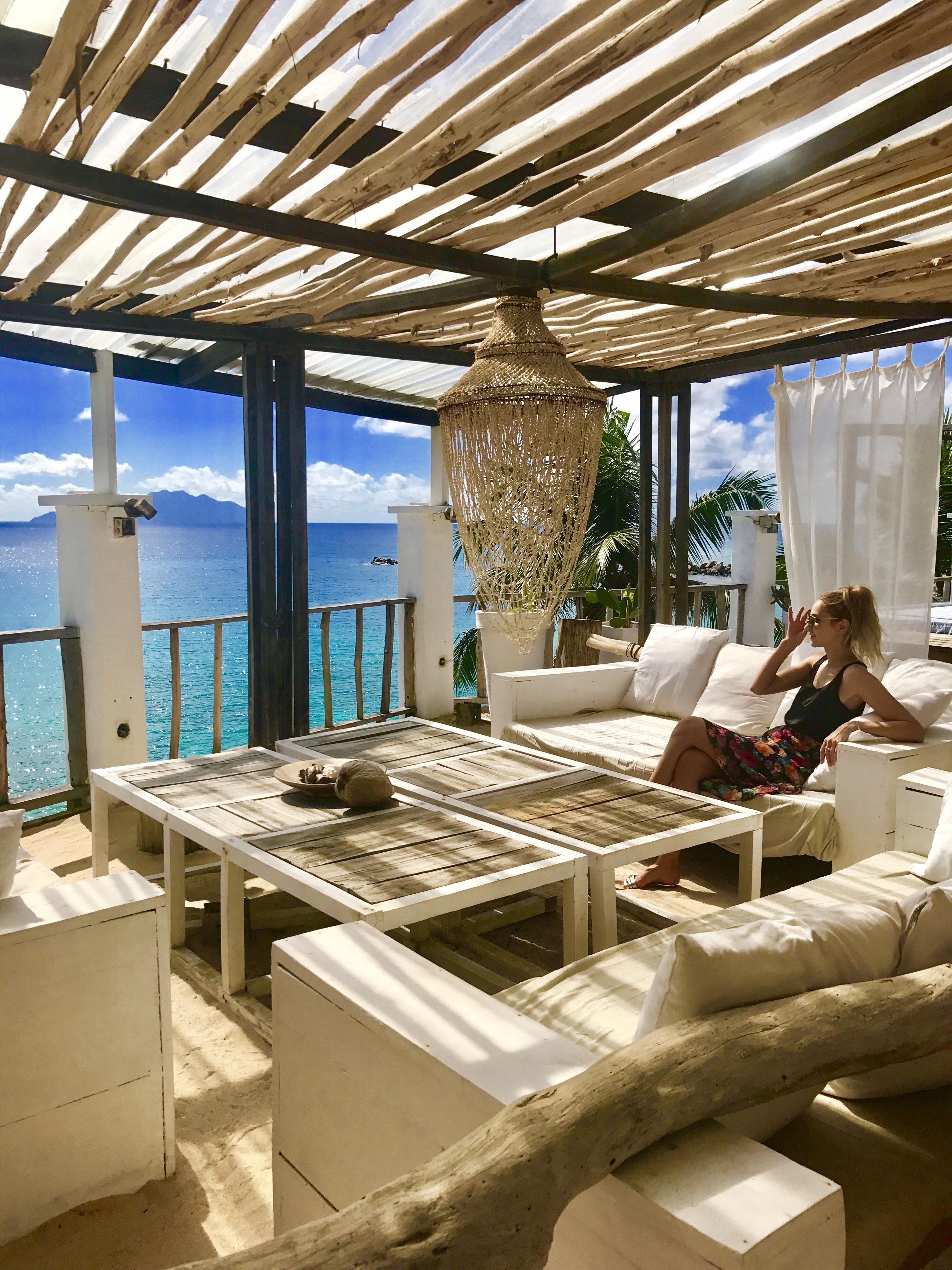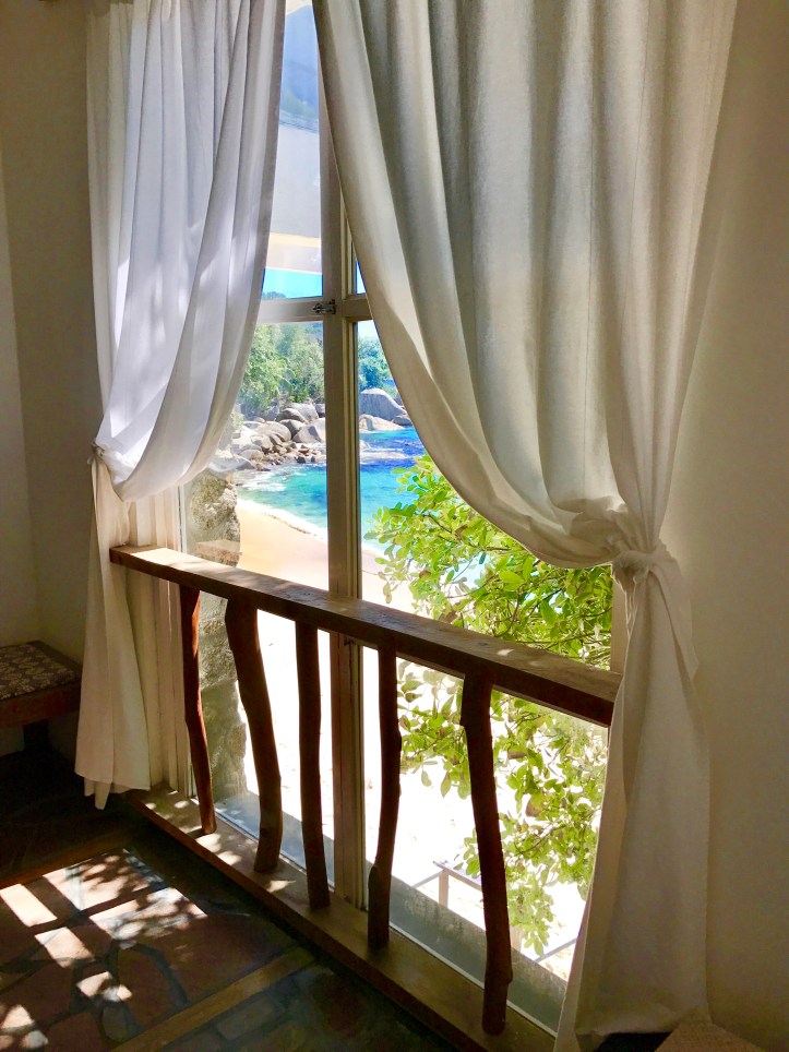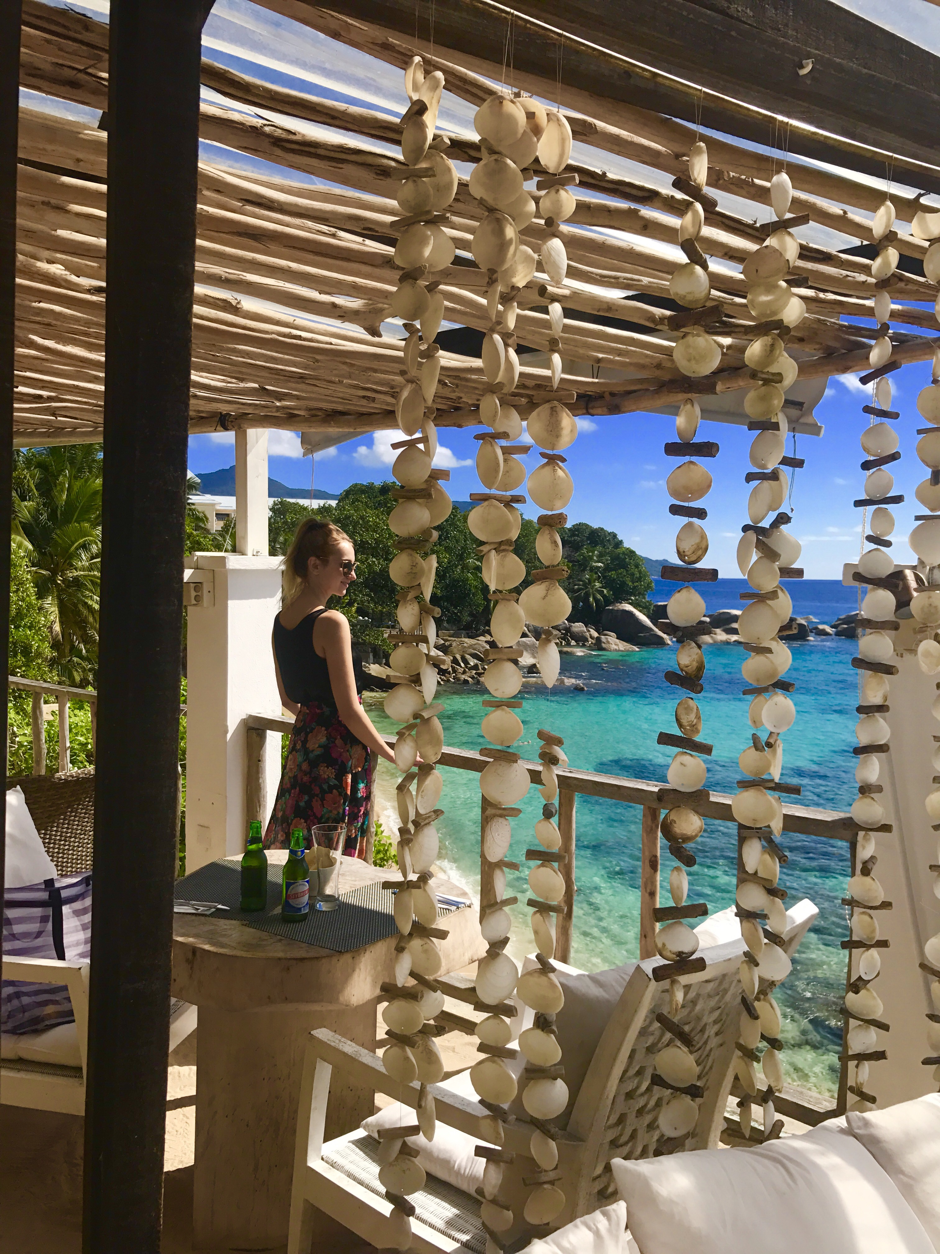 The restaurant is decorated in the same style with large white beds and hanging shells. We find a good table with sea view, just perfect to start our first day in Seychelles. While we are busy picking up the fruits for the breakfast, two naughty birds are already savourating a delicious croissant that I left careless on the table. I cant help but laughing of their “rudeness” and I offer them other items from the menu making sure that my new winged friends are enjoying a full complimentary service.