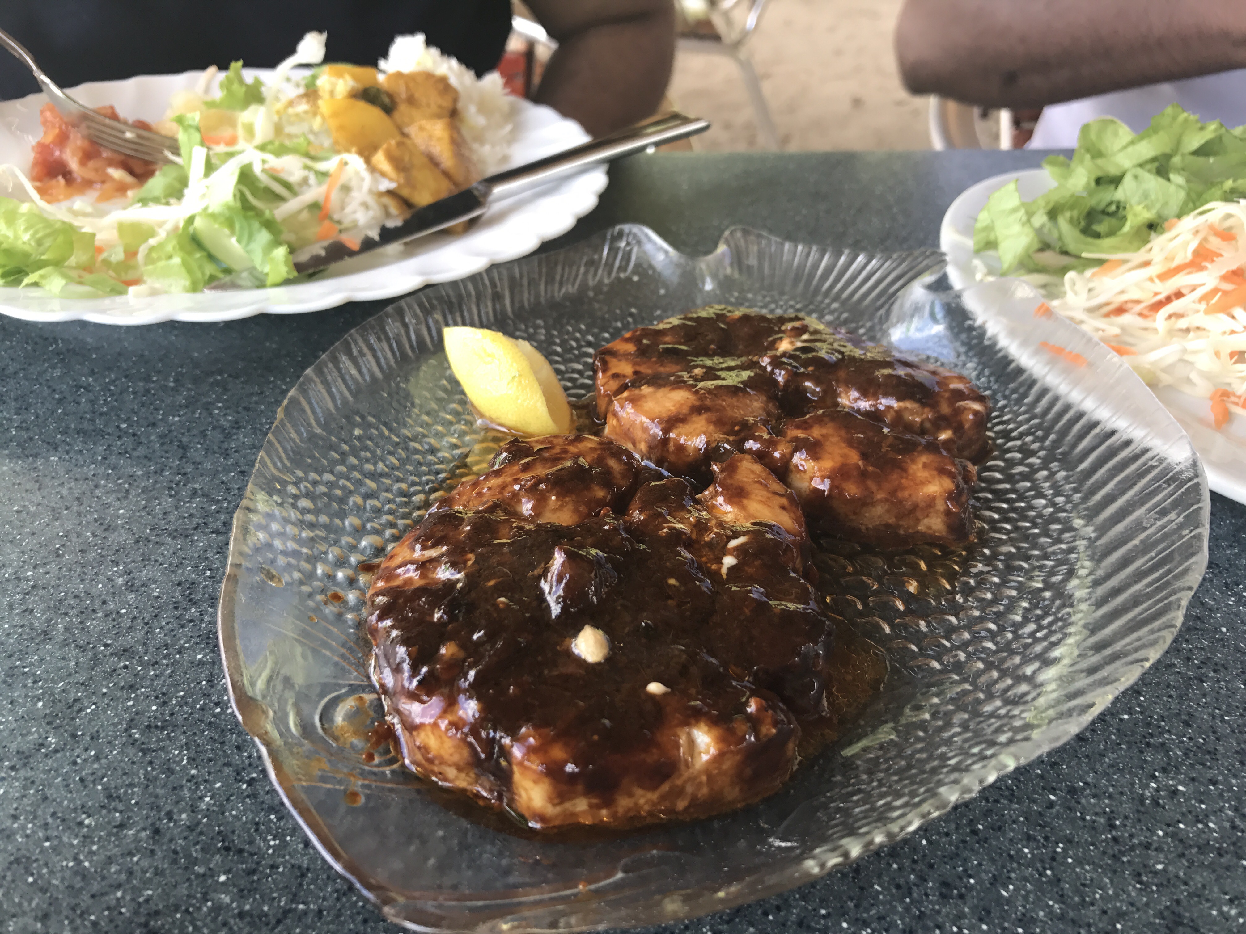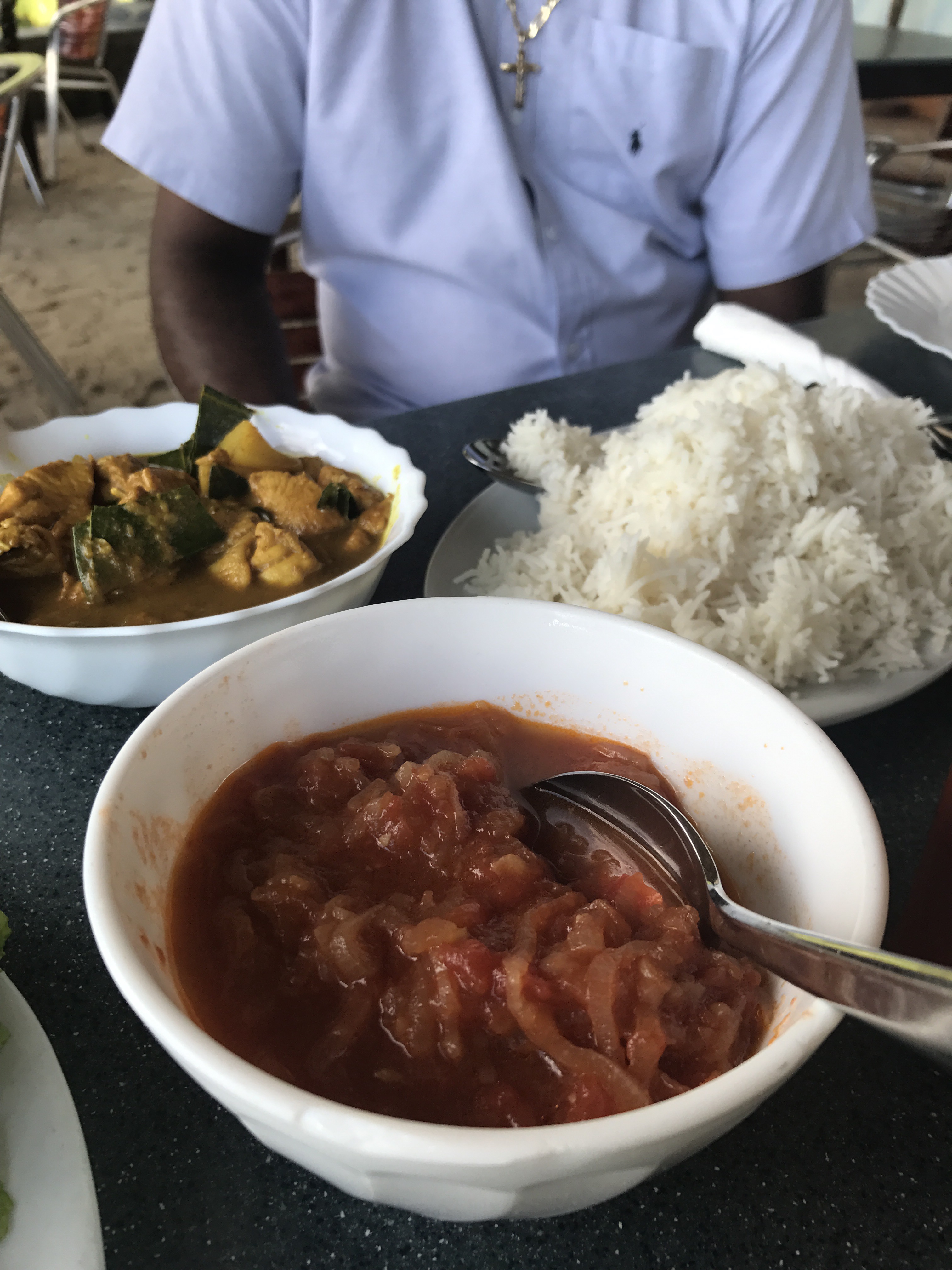 We decided on something more familiar: chicken curry, rice, tuna steak and creole sauce. I totally dislike the food but I am trying not to offend our driver who seems to be delighted with his choice. I fill my stomach mostly with rice and coke, we thank the staff for their “kindness” and run away of this place…for forever.