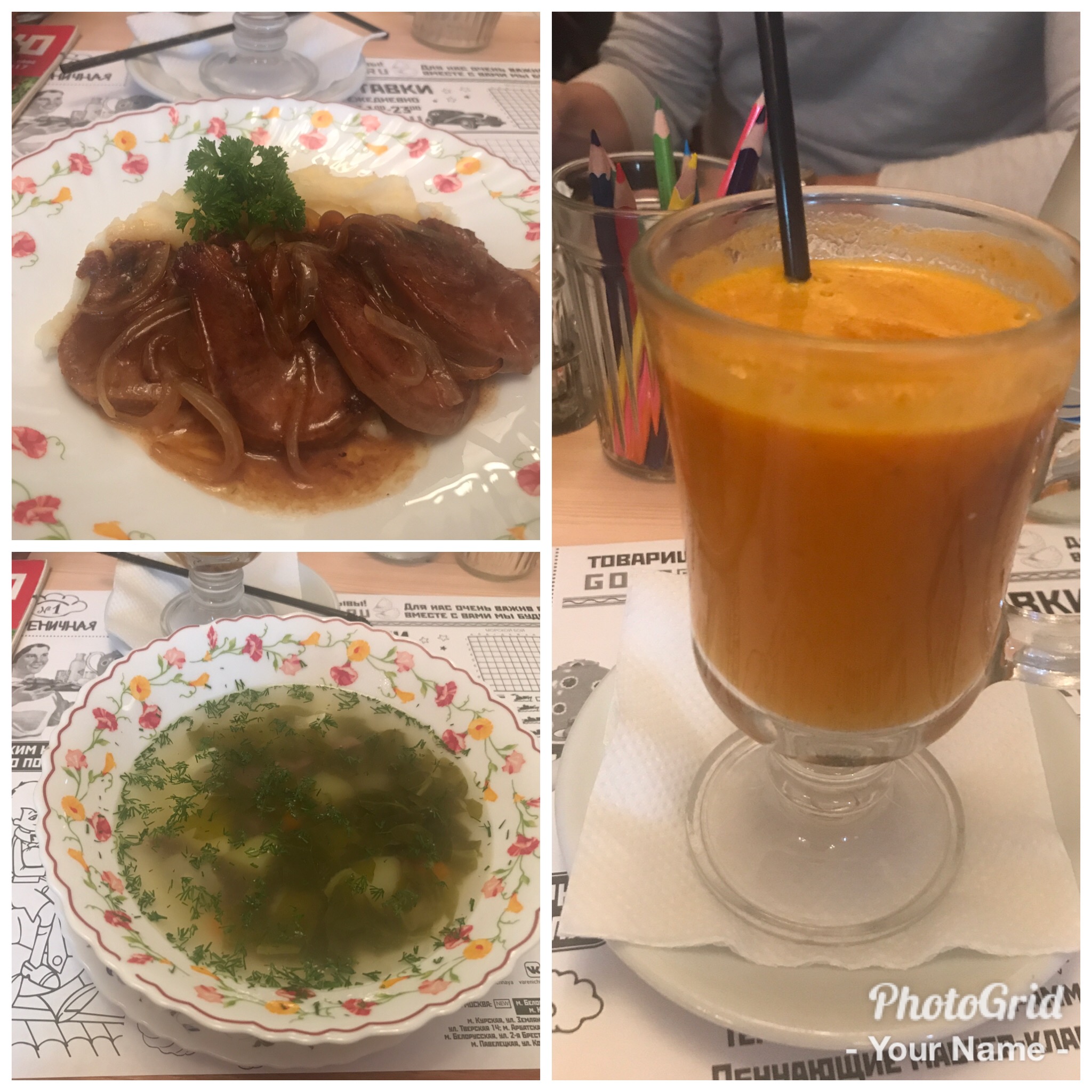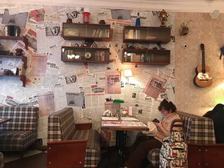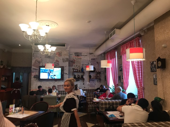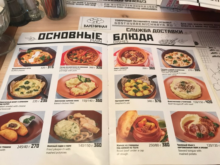 Surprisingly russian food is not very similar with my country’s food (Romania) even though our past is so close connected. I open the pages of the “slavic magazine” which serves as menu card and I choose a soup and a main course based on the pictures displayed.