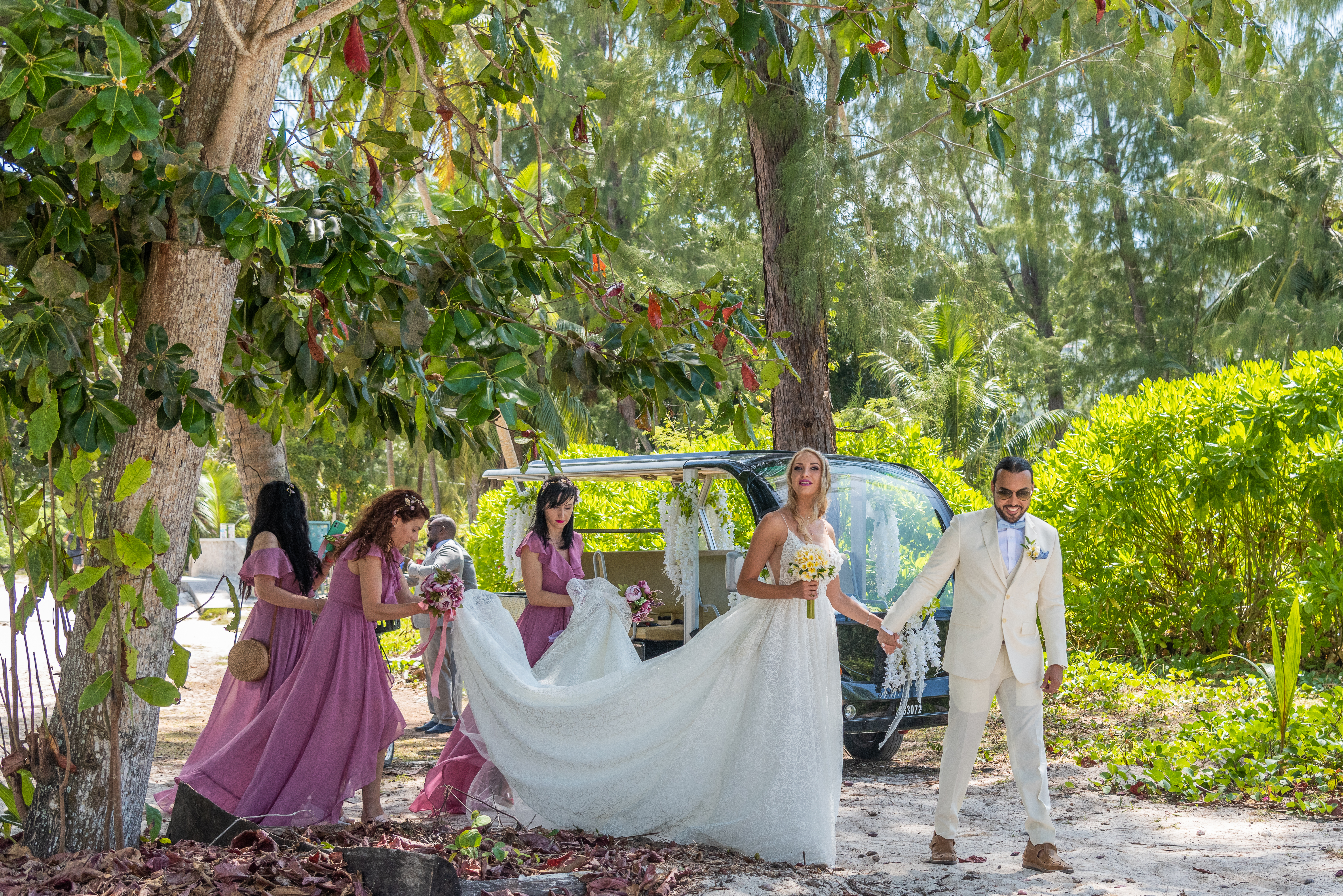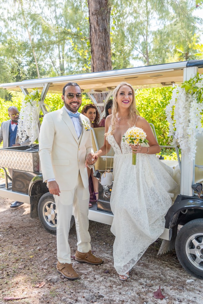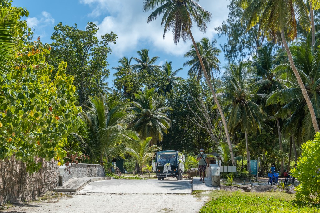 As La digue is a tiny island where the main means of transportation is the bike, we were drive to the venue with a cute budgie beautifuly decorated with white flowers.